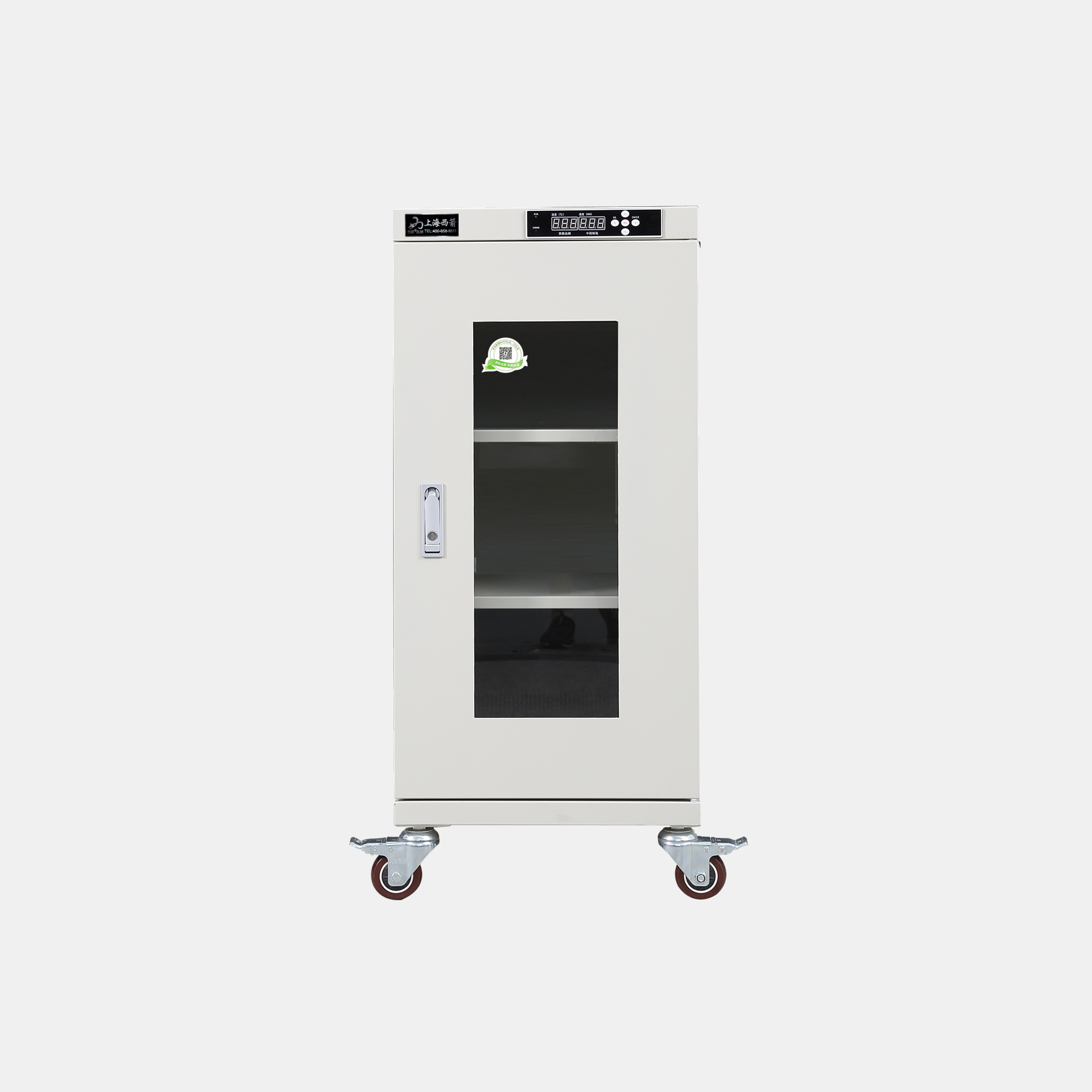 3.防潮箱門玻璃區(qū)域選用3.0mm鋼化玻璃,防前傾耳式結(jié)構(gòu)設(shè)計(jì)。帶平面加壓把手鎖*體化設(shè)計(jì),有防盜功能。**部安裝可移動(dòng)帶剎車腳輪方便移動(dòng)及固定(防靜電機(jī)型腳輪為防靜電)。