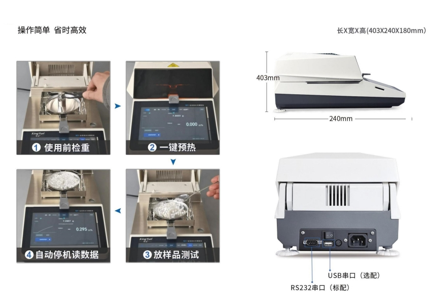KX-F系列智能水分測定儀集成了KOLAB 科西水分測定成熟技術,使整個分析系統更加**善。采用高效率的烘干加熱器-高品質環狀鹵素燈進行加熱,對樣品進行快速、均勻的加熱;儀器設計智能化、簡單化,實現了用戶*鍵式測量功能,*需**業知識。因*同行業對水分有著*同的定義,為滿足用戶的需求,KX-F系列內置多種水分顯示方式,包括但*限于含水率、固含量、回潮率、木材含水率等多種模式,并針對*同行業的*同樣品,儀器預留了多種用戶自定義測定方法,用戶可根據實際需求設置測量模式,自定義程序自動儲存,調取方便、快速,滿足行業多種樣品的測定需求。該系列水分測定儀全金屬機身、支持高溫檢測,升溫快、加熱均勻、使用簡單、壽命長等特點。